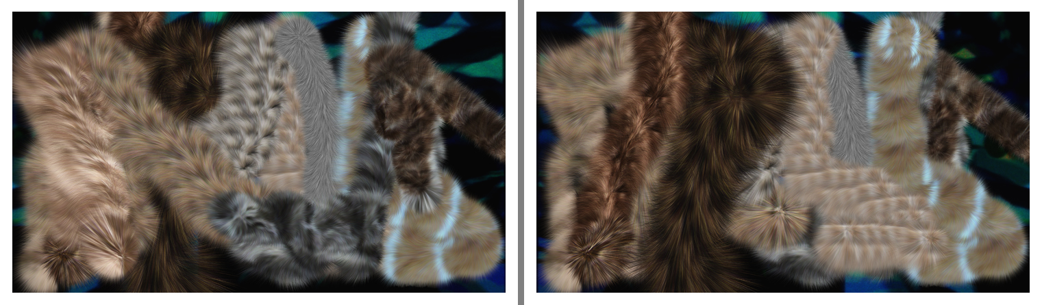 I built custom digital brushes following patterns of precious animal furs, and trained them digitally to track the motion of elements in my various films. The performed painting pairs spacially stagger the layers of motion front to back and back to front. Each pair was performed by a different film.